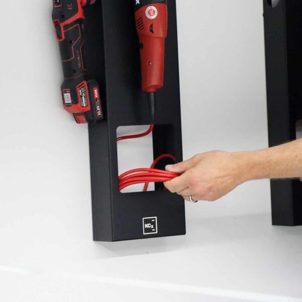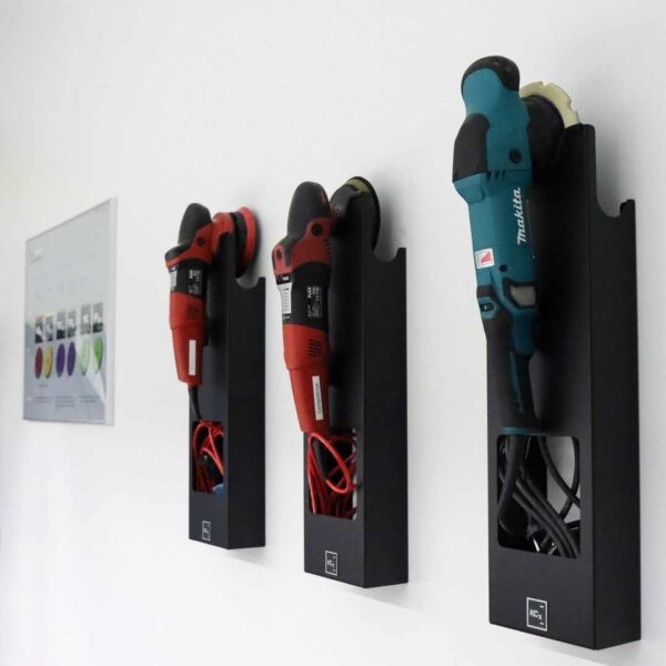 Stenski nosilec za polirno napravo. Primerno za ekscentrične in rotacijske polirne stroje s premerom plošče do 180mm, stranski izrezi pa so primerni za majhne polirne stroje. Izdelan iz 1,5mm debele pocinkane, prašno barvane kovine.