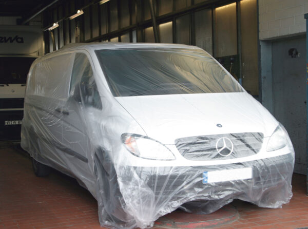 HDPE zaščitna maskirna folija. Transparentna, statična in odporna do 110° C. Vozilo mora biti obvezno suho. Velikost: 600cm x 120m.